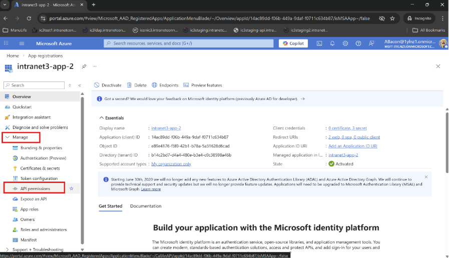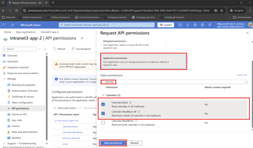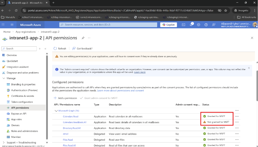 8. Verify Permissions: Ensure the new calendar permissions appear in the API permissions list and that the status shows 'Granted for <organization>'.