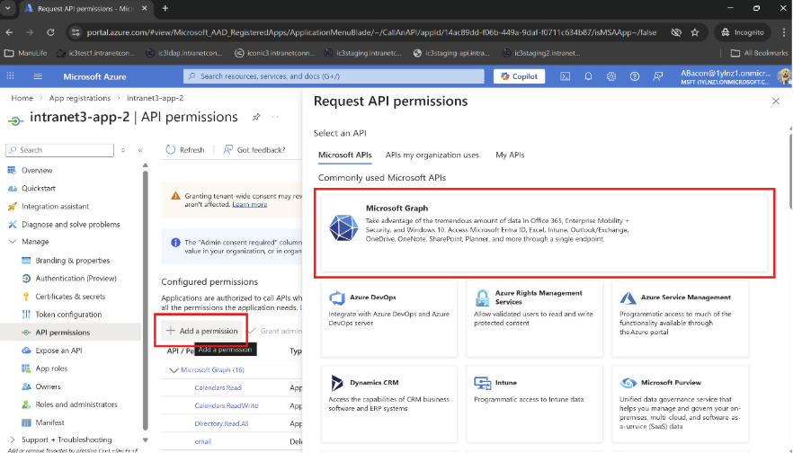 Adding Calendar API Permission for Microsoft Graph in Azure Portal