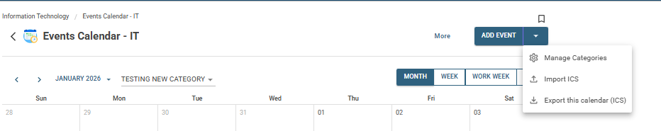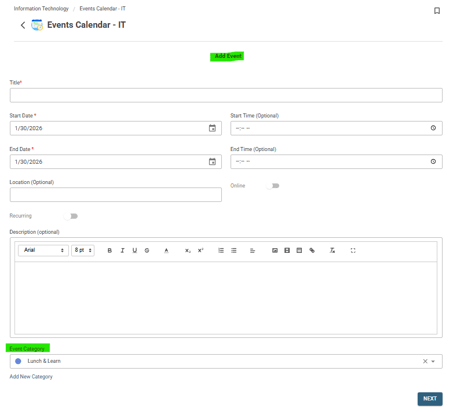 To add a new event, click Add Event, then enter the event details using the customization options below. You can also select a different category before publishing.