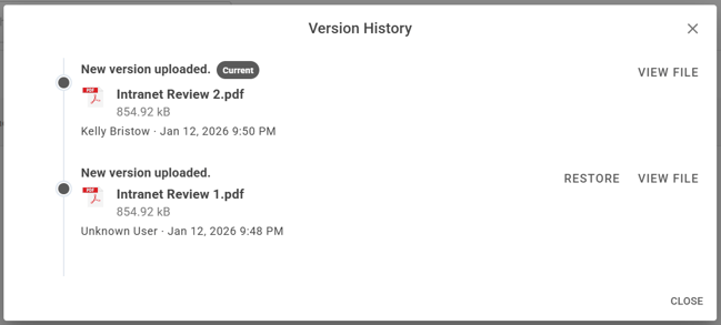 Once a new version is uploaded, click on Version History to view past versions and confirm which version is the current version.