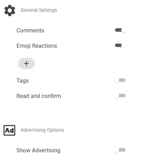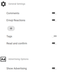 App Settings: Toggle comments, emoji reactions, Read & Confirm and Advertising Options