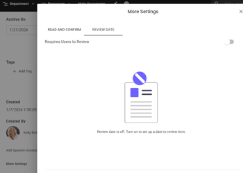 A common issue is for documents, policies, etc. to get added to a Document Repository and go stale because they were added and never reviewed. The Review On feature addresses this issue by giving a reminder to the document owner that it's time to review - and potentially update - their document.