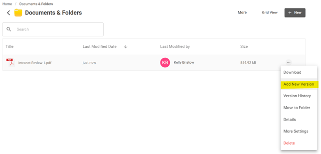 To start utilizing the File Versioning functionality, after a document is uploaded into the Documents app, you will see an option for Add New Version. Click Add New Version to upload a new version of the document. The new file will be set as the current document, and previous file uploads will be retained as versions.