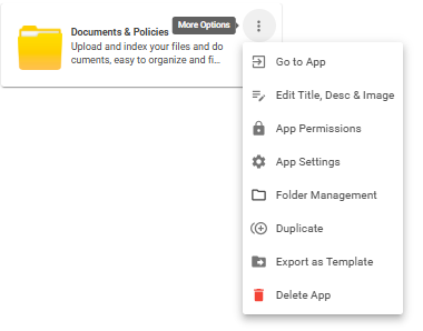 Settings for the Documents & Policies App are put in place by an intranet Admin, as for all Apps. App settings are accessed by clicking the three columns on the App card.